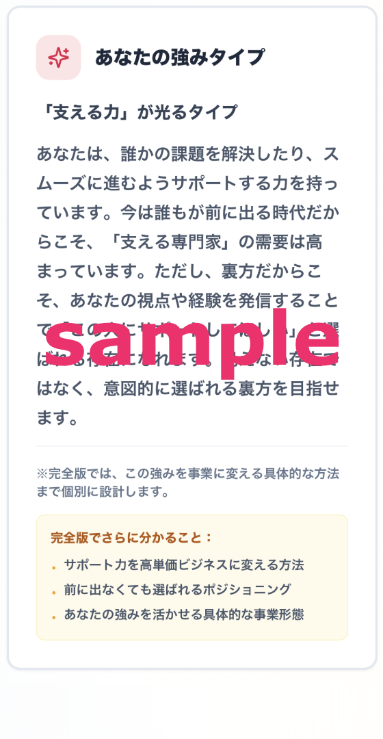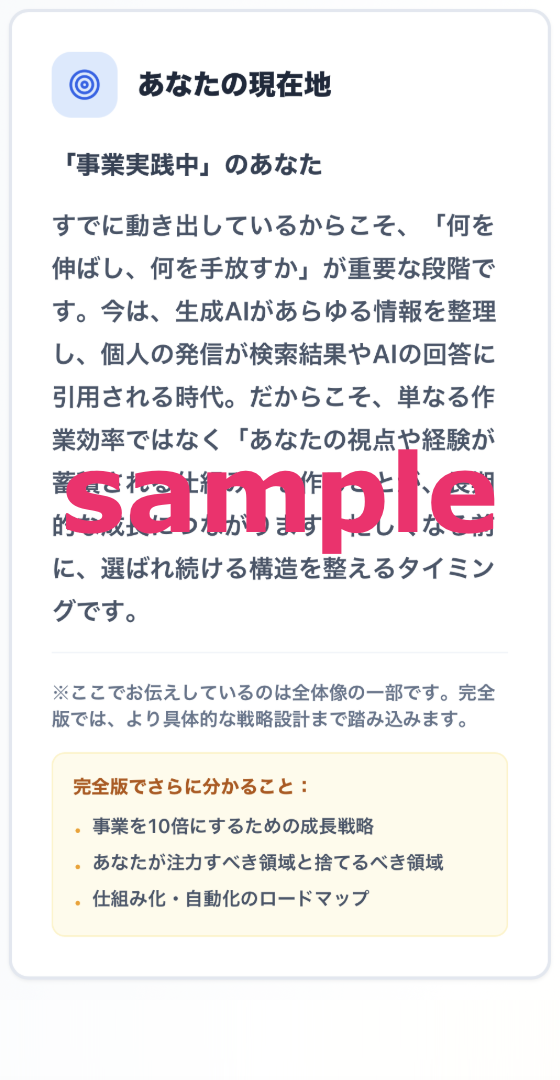 あなたの診断タイプ総評(2025年市場視点)/今の市場構造とあなたが立つべき場所/あなたが参入すべき“最適市場”/商品の切り口(Before→After 付き)/あなた独自の USP(強みの言語化)/発信テーマの方向性/今すぐ動ける具体的アクションプラン/市場での立ち位置(ポジショニング)/キャッチコピー案(用途別)/といった内容を把握していただけます。また、完全版PDF開封者にのみ配布している特別権利もございます。