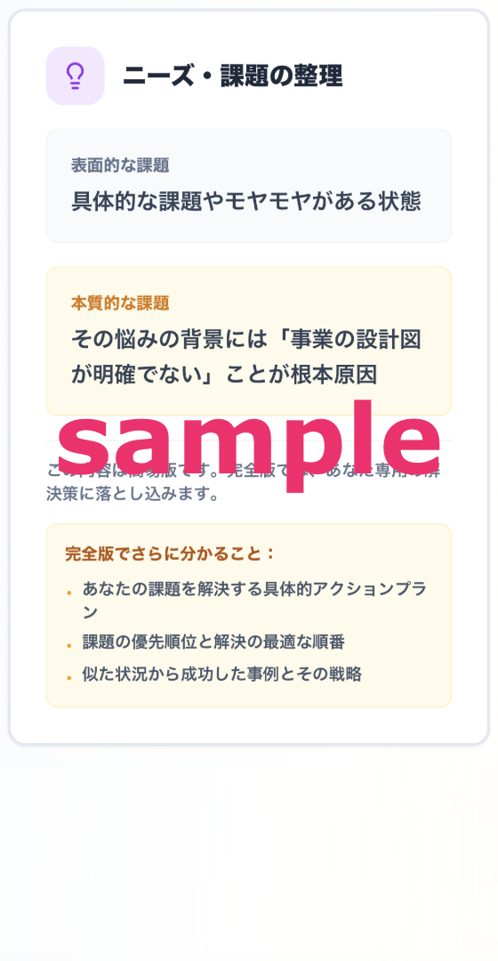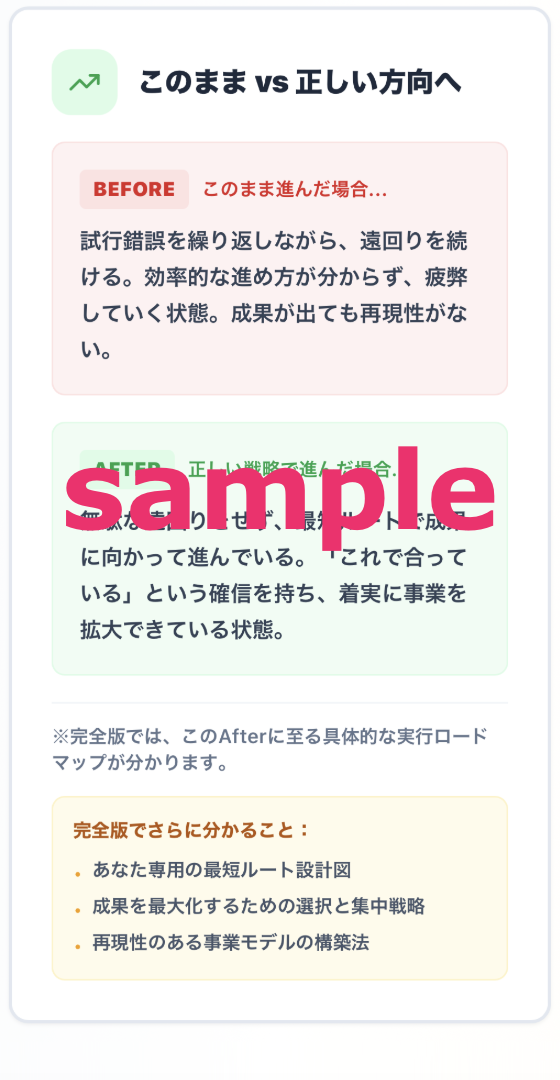 あなたの経験・強み・価値観から、無理なく勝てる市場領域を論理的に特定します。『市場ジャンルの方向性』『なぜその市場が合うのか』『逆に避けるべき市場の特徴』が明確になります。